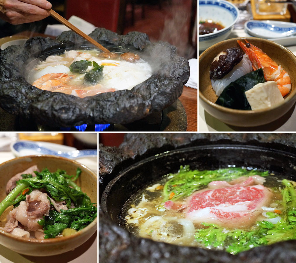深めの器で作る鍋。浅い器で作る焼き物の2種類だけしかここにはなくて、夏にはさすがに石版料理の方が人気があるよう。ほとんどのテーブルには浅い器がセットされてた。