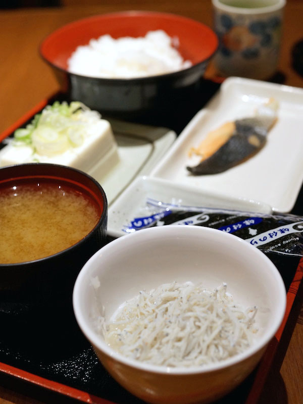 メインの料理にしらすおろしに海苔、漬物、味噌汁、ご飯がつく構成。鮭の焼いたのと冷奴をメインに選んで、ご飯は少な目、半ライス。