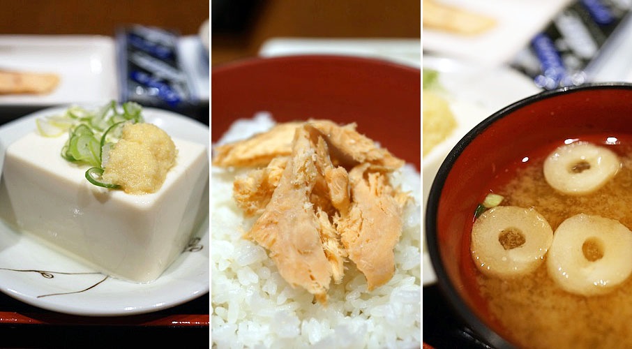 鮭の定食に冷や奴を追加したのがいつもの注文…、今日も同じでご飯を控えめ、半ライスにする。