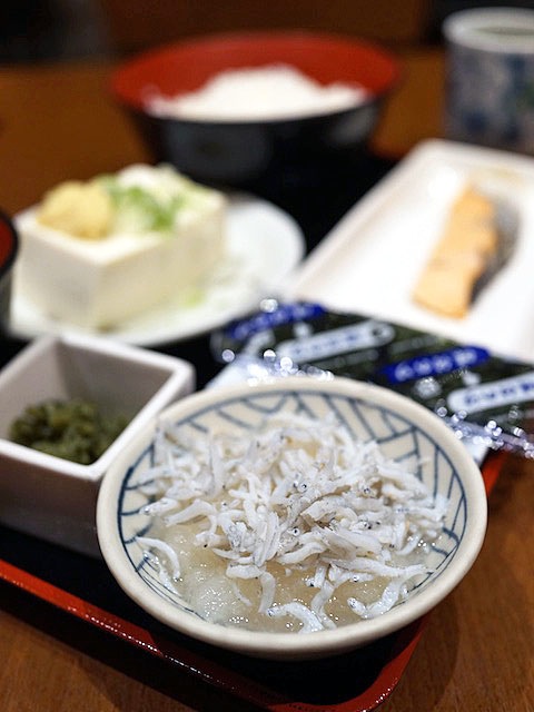 すべての朝の定食には、メインの他にご飯と味噌汁、味付け海苔に漬け物、それからしらすおろしがつく構成で、お盆の上がギッシリにぎやか。