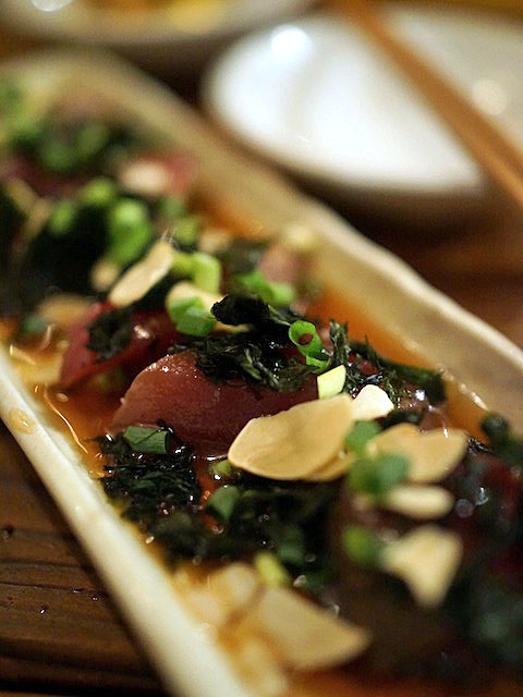 最初に載せた写真の料理…、カツオを軽く炙ってポン酢、干したワカメとにんにくチップと一緒に食べる料理で、ムッチリとしたカツオの歯ごたえ、味わいが夏。