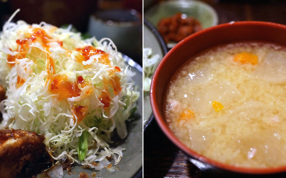 それからキャベツ。スイートチリソースが用意されているのがココのおもしろいとこ。キャベツにタップリかけて食べると、甘み、辛味がほどよくなって、シャキシャキとした歯ごたえたのしく、食、進む。