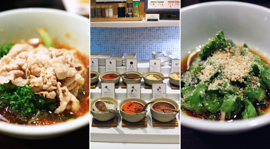 大根おろしに生姜ににんにく。もみじおろしや擦った胡麻。食べるラー油や中国風の辛味噌と、それらを使って自分好みの味にする。