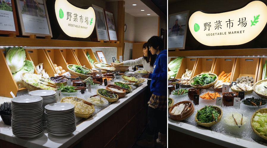 全部で20種類はあるでしょうか…、いろんな野菜を取り放題のサラダバーのようなエリアが作ってあって、それを鍋にして食べる。