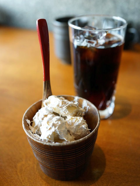 デザートにバナナのクリーム和えをもらって、アイスコーヒー片手にパクリと。