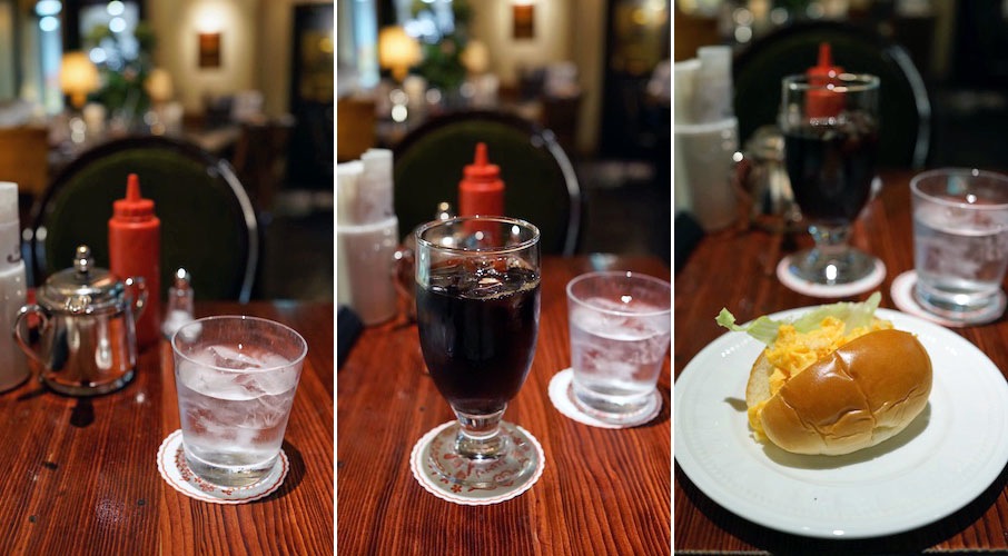 まずはお冷がやってきて、続いてサンドイッチ用のケチャップに塩…、それからアイスコーヒーがくる。