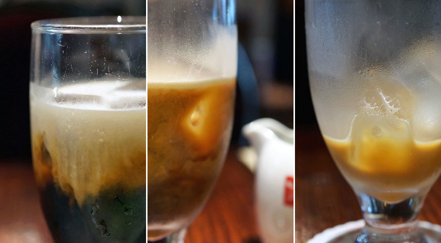 足のススッと伸びた細身のゴブレットに氷をギッシリ。そこにトクトク、コーヒー注いで冷ましたモノ。