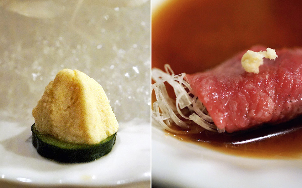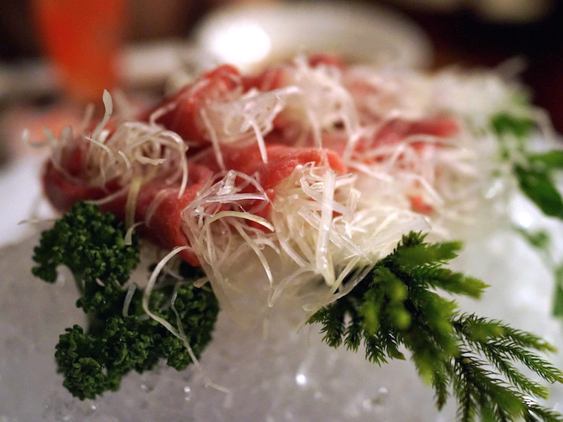 脂の少ない牛赤肉の、表面だけをこんがり焼ききり、それを薄切り。お皿の上に氷で作った小山を築き、そこにキレイに肉を並べる。