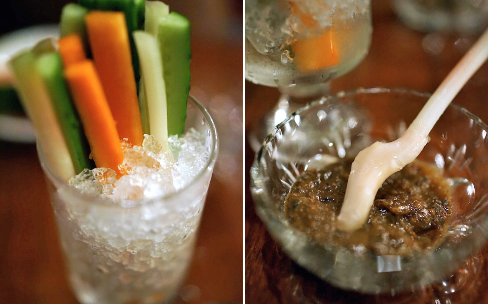 タンブラーにギッシリ、クラッシュアイスを詰め込みそこにキュウリにセロリ、ニンジン、生姜を差し込んでいる。そのスティックの太さがとても繊細で、パキッと歯切れる食感を残してギリギリ細くしている。