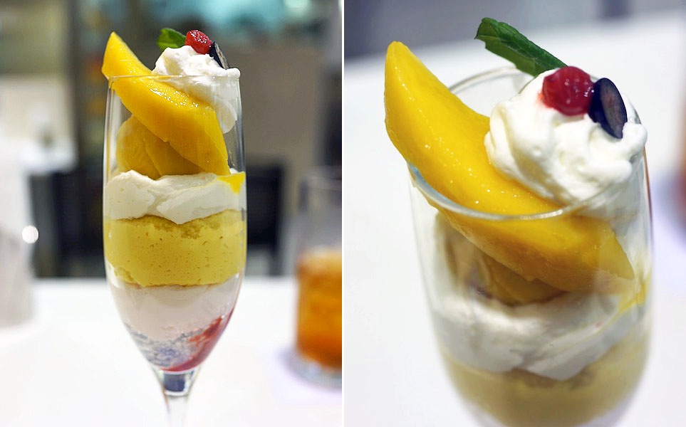 食後に小さなパフェがついてきます…、今の季節はマンゴーのパフェ。