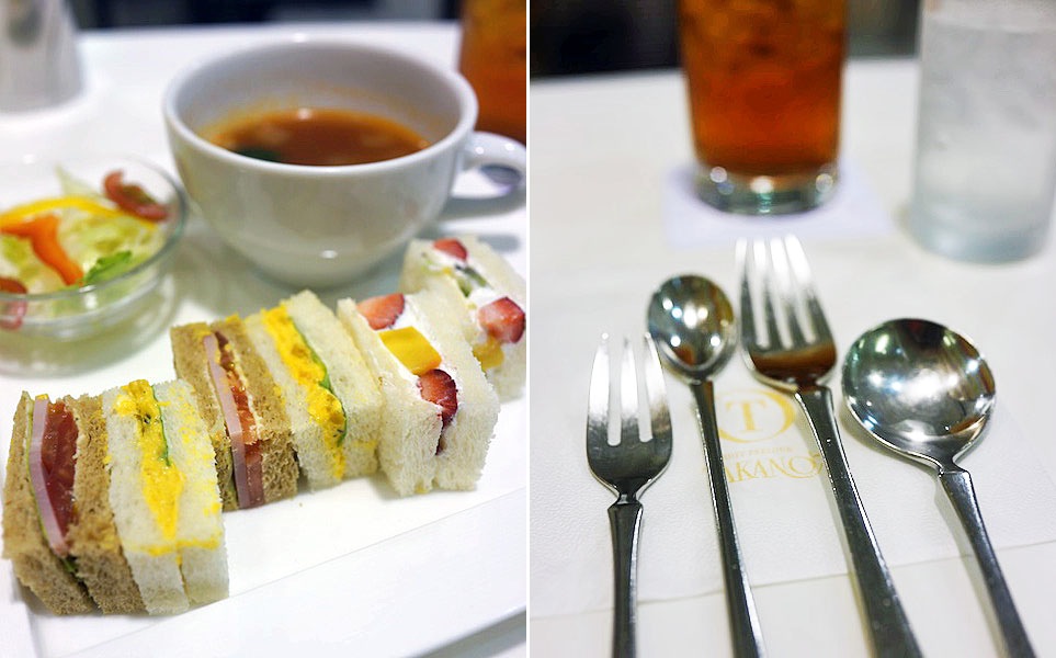 軽い食事の用意もあって、サンドイッチをメインのセットを選んでたのむと、ズラリとナイフやフォークが5つも並ぶ…、スープ用にサラダ用、それからデザート用にといろんなサイズがあれこれキチンと。