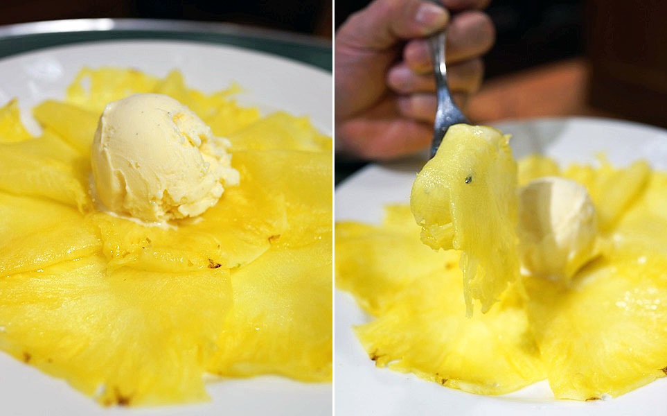 うすぅく切られたパイナップルの繊維がゴツゴツたのしくて、酸味、甘みに香りが口の中でユックリ広がっていく…、そこにヒヤッとアイスクリーム。