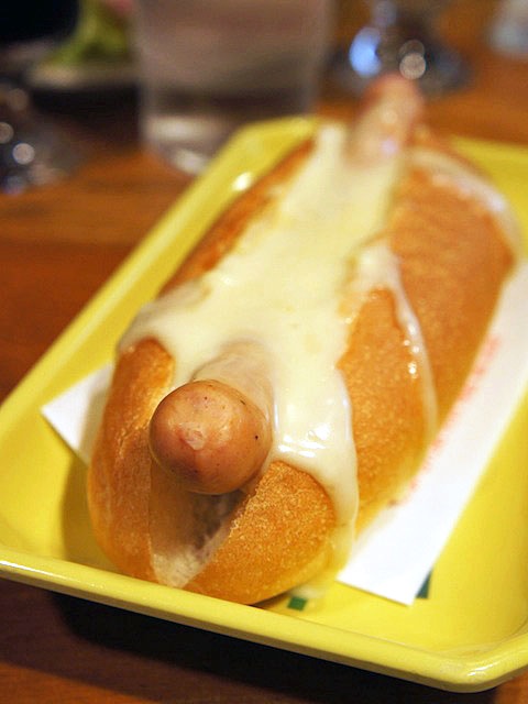 四種類のチーズをブレンドしたものを、白いワインでトロトロにしたのをタップリ、ソーセージの上にかけまわしガーリックパウダーで風味を付けるという贅沢さ。