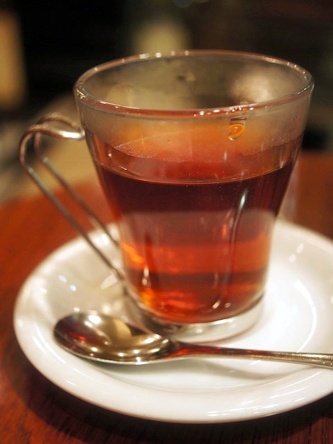 温かい飲み物を、ガラスの器に入れて飲む。