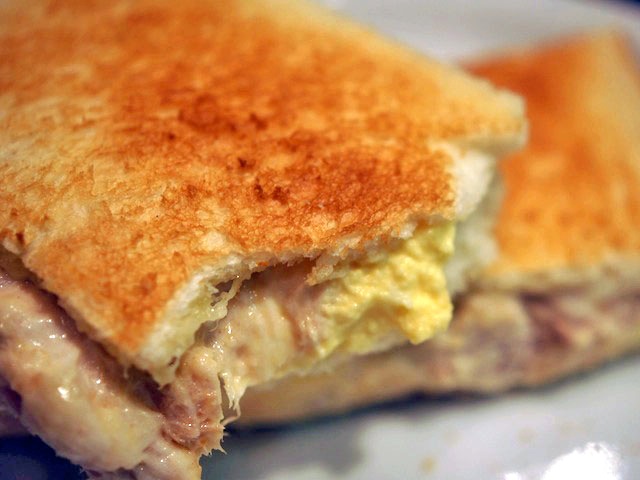 ツナのマヨネーズ和えと、茹でた玉子のサラダをそれで挟んで再び、トースターで焼いて仕上げているのでしょう。