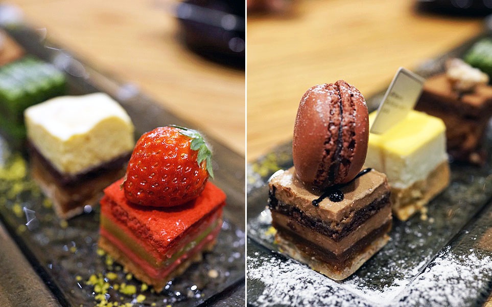 彼がパリで名をあげるキッカケになった抹茶のケーキや、季節のイチゴ、マカロン付きのフォンダンショコラと全部で6つのケーキがテイスティングサイズでやってくるプレートで、目にうつくしく、食べておいしい。