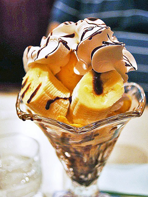 バナナに缶詰みかんにそれからチョコシロップという、どこをどう観察してもチョコレートパフェにしか見えぬ物体…、ニッコリします。