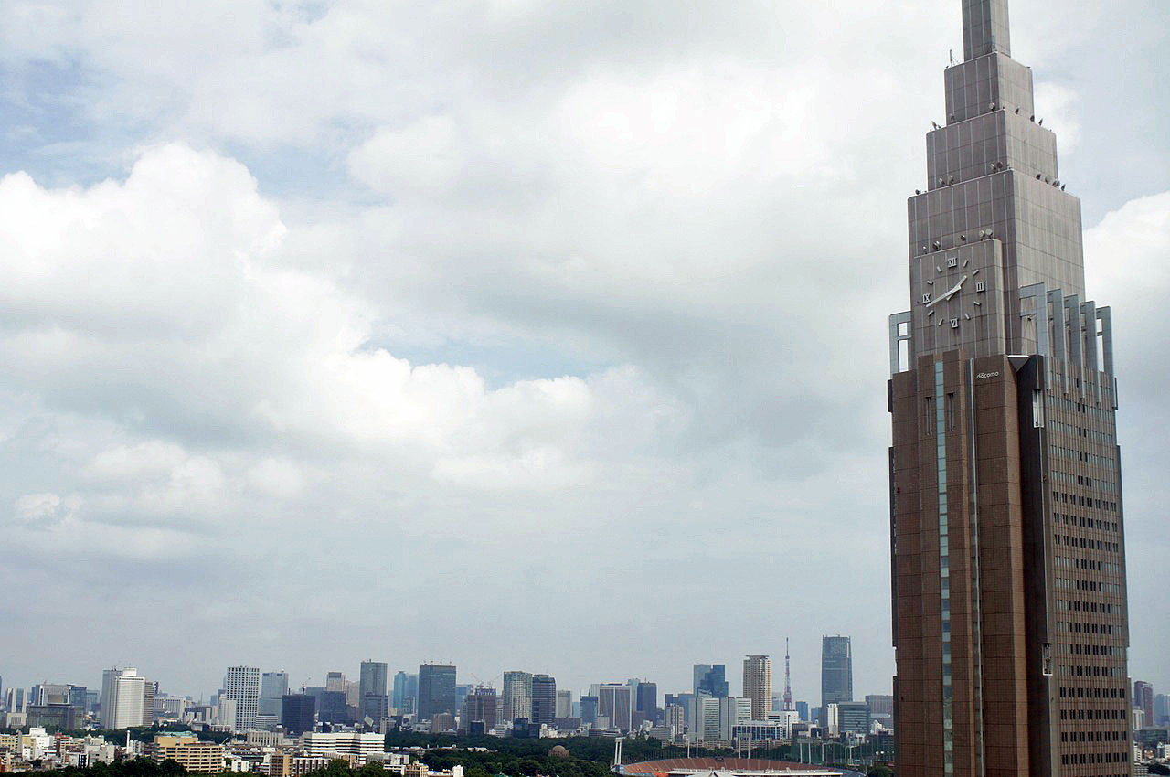 下から見るとエンパイアステートビルのように見えるdocomoのビルもこうして、間近にみると時計台のように見えるのがオモシロイ。