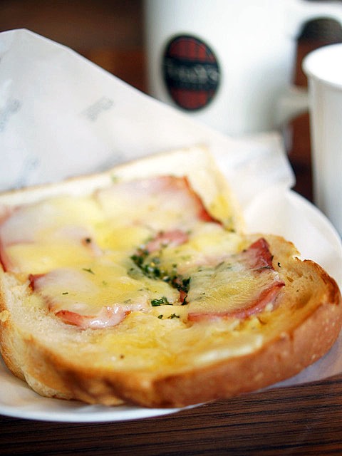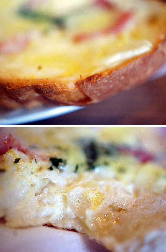 トーストブレッドの乾いた食感とチーズにホワイトクリームのとろけ具合がまじりあい口の中がとてもにぎやか、幸せになる。