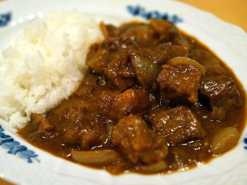 マスコット社の辛口カレーをパカッと入れて、水で濃度と辛味を加減しながら煮込む。土鍋ご飯と一緒に食べた。