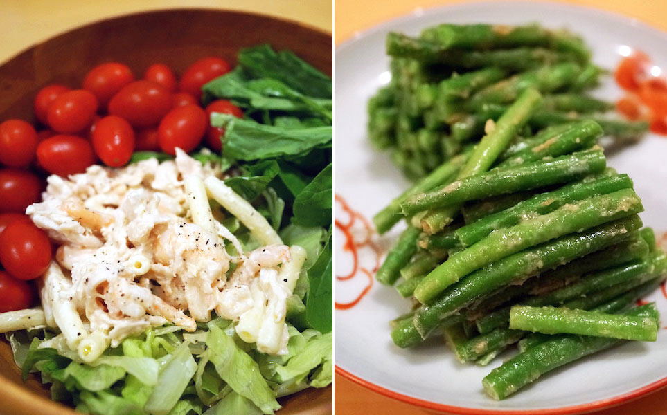 それでマカロニを茹で、蒸したチキンブレストにゆでエビをマヨネーズであえたマカロニサラダと、ちぎったレタスにルッコラ、トマトと一緒に混ぜ、食べる。