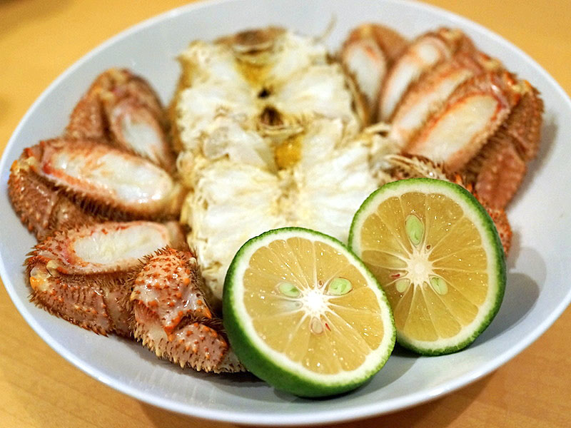 まずは蒸し蟹。毛ガニの程よく大きなモノを、蒸して冷ましたモノが売ってた。一緒にすだちを買って搾って、そのまま食べる。