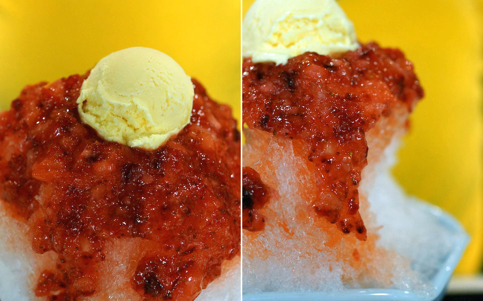 器の底には白蜜少々。山なりにした氷の上に、イチゴを炊いた自家製ジャムとアイスクリームだけという、シロップ使わぬ自然なおいしさ。
