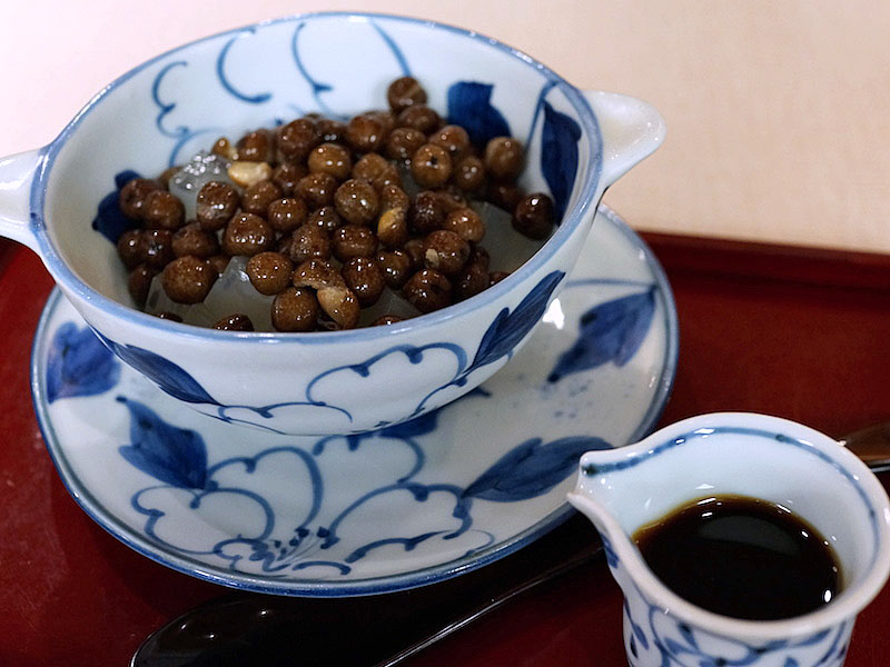コツコツ固めに炊きあがった赤えんどう豆のほのかな塩味。噛むとほろりと崩れてかすかな甘味を滲ます味わい深さ。ポッテリとした黒蜜の、スッキリ切れのよい甘さと、味わいおだやか。最後に磯の香りが残ってウットリします。オキニイリ。