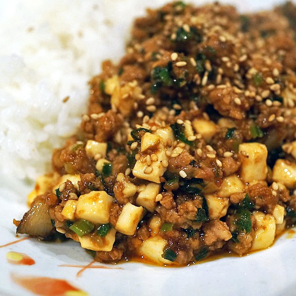 ホツホツひき肉おいしくて、固めご飯にツルンとすべる絹ごし豆腐。