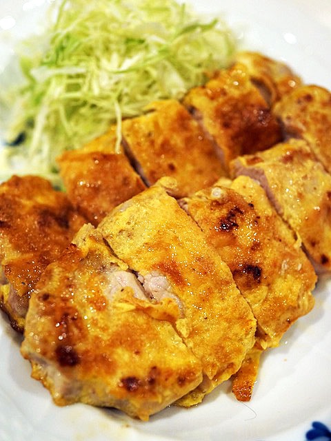 表面の玉子が固まって来たら再び玉子をくぐらせ、裏返しにして蓋して蒸し焼きというその工程を都合、3回ほどもくりかえし中まで熱が入ったところで出来上がり…、スパッと切って千切りキャベツと一緒にお皿に盛り付ける。
