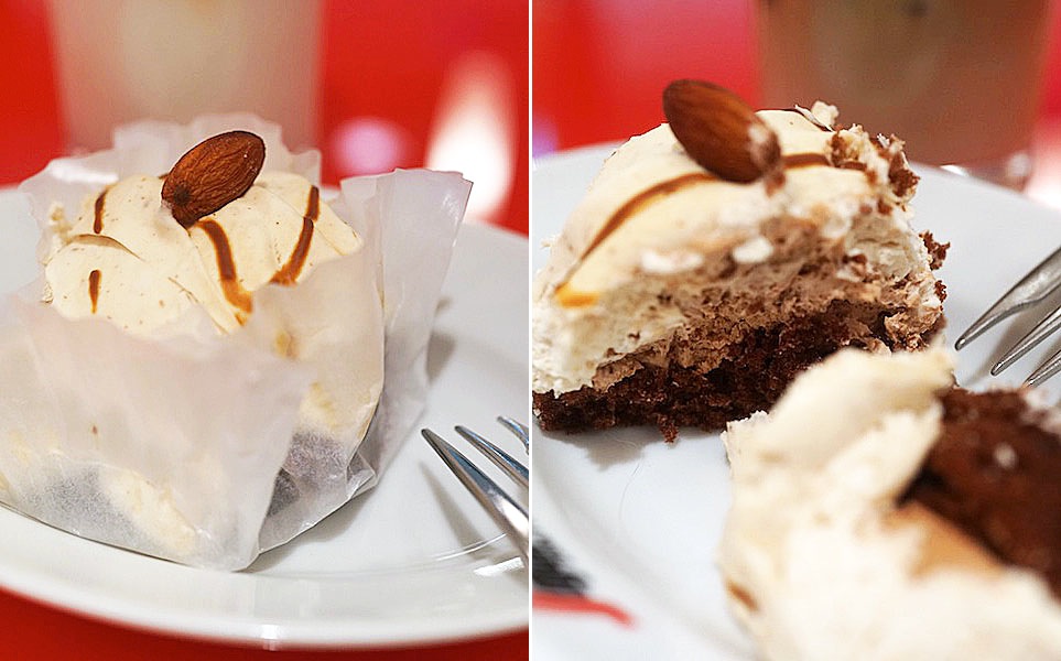 今の時期、チョコ買い男子は肩身が狭い…、クーポラというプラリネ、ホイップ、カカオ風味のスポンジケーキを重ねて作ったヘーゼルナッツ味のケーキを選んで食べる。