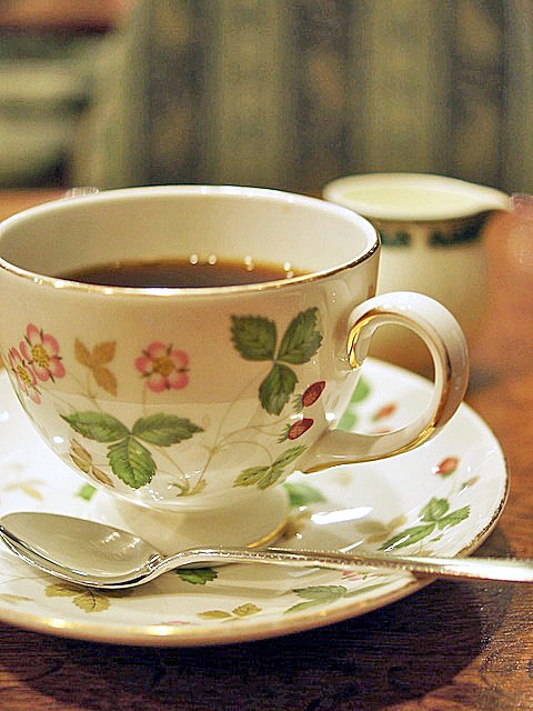 コーヒーたのんでやってきたのがウェッジウッドのようなカップで、模様タップリ。