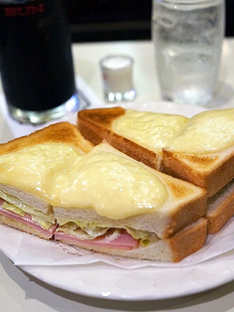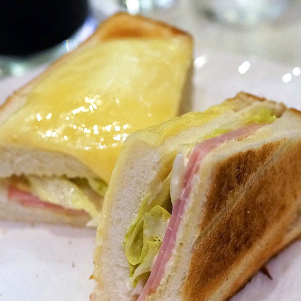 ハムとレタスを挟んだモノで、なのに上の部分にチーズがトロリ…、チーズトーストとサンドイッチの合体版っていう趣向。