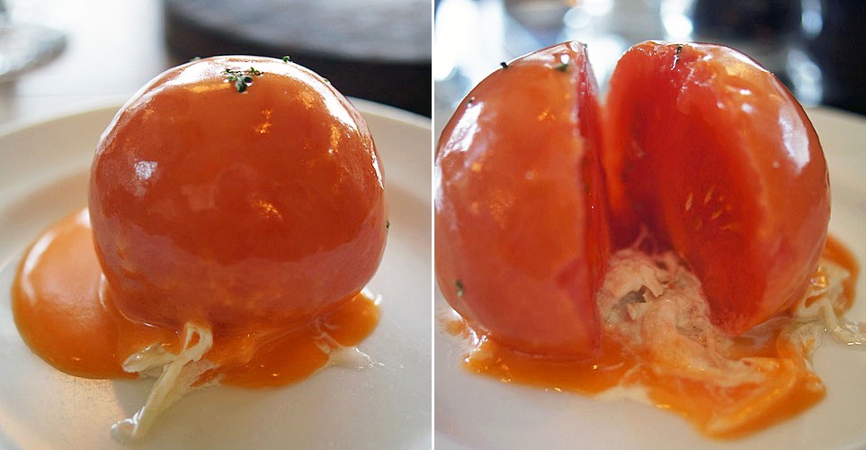 ほどよきサイズのトマトにツヤッとドレッシングがかかったそれを、スパッとナイフを入れて切り分ける…、と、ちょっとガッカリ。