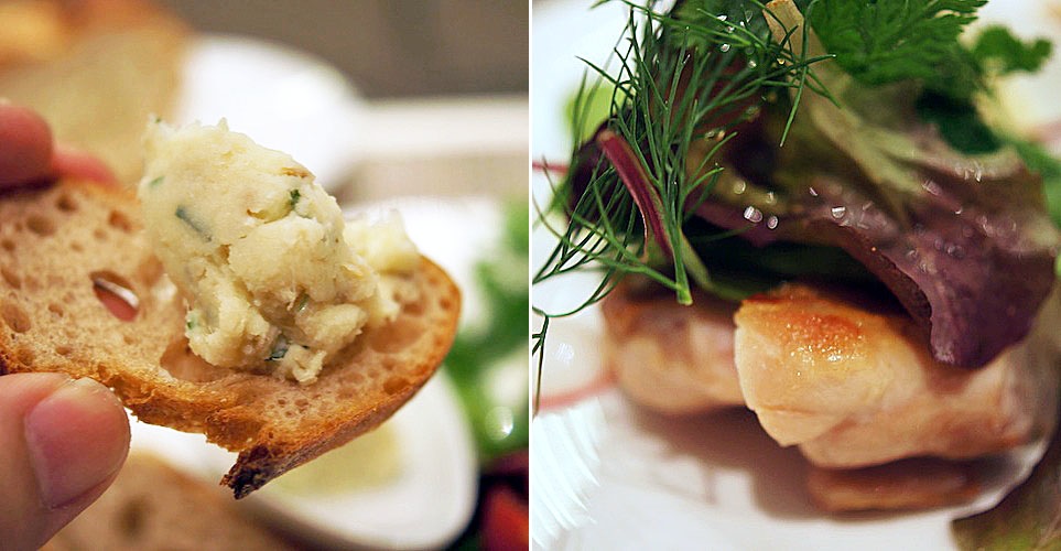 魚の白身と茹でたじゃがいもを合わせたサラダをそのまま食べればただのサラダ…、それをトーストした極薄バゲットに塗って食べると前菜料理になるのがたのしい。