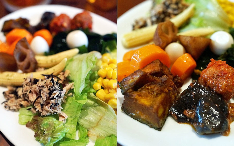 茄子のトマト煮、カボチャのロースト、キャロットグラッセ、レンコンのバルサミコ煮にワカメのグリル。なぜだかうずらの玉子があって噛むとプチュっと潰れて黄身がとろけて出てくる。