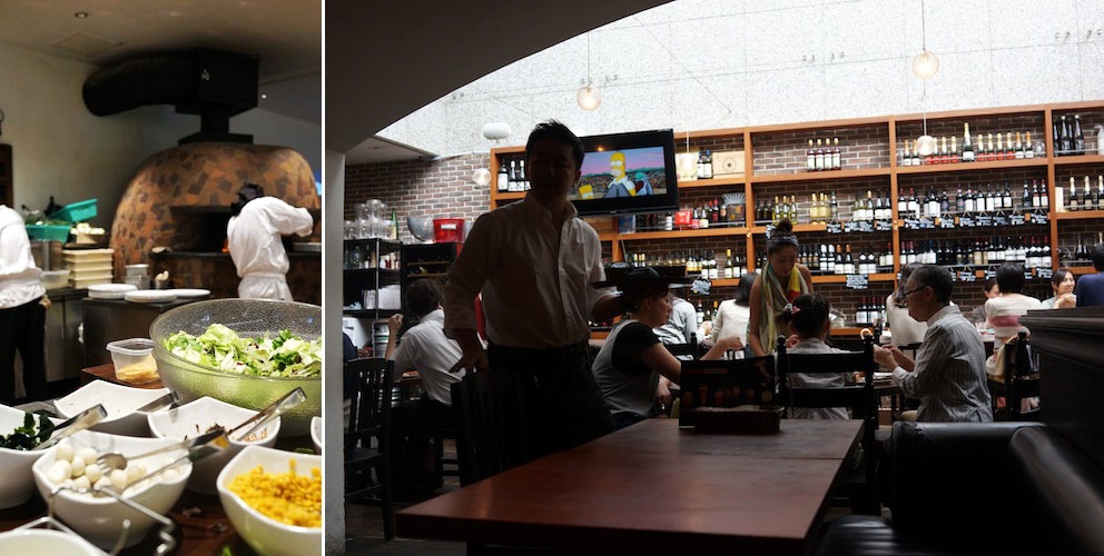 さすがに満席…、1時を過ぎた遅めの時間でもう一回転目が終わってて、ちょっと待って案内されたテーブルはピザ窯の前、ホールの全容がみわたせる一等席で思わずニッコリ。
