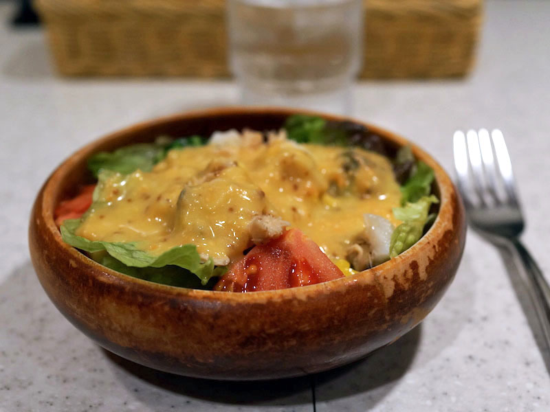 胡麻の風味のドレッシングの中にタップリ缶詰のツナ…、葉っぱ野菜に茹でたタコのゲソがはいってクニュクニュ食感ひきたてる。