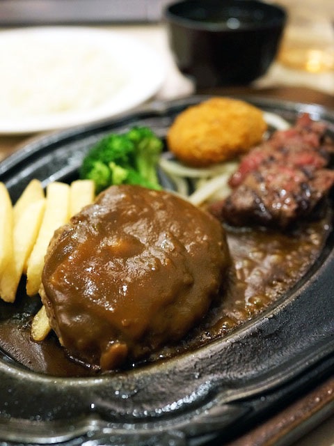 ハンバーグとカットステーキが鉄板にのってジュウジュウやってくるモノ。