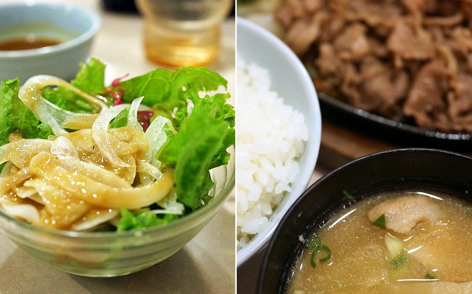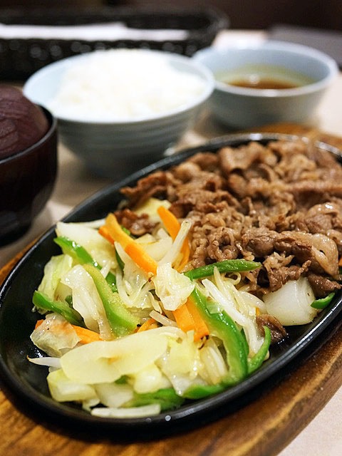 和牛切り落としと野菜を一緒に炒めてたのしむ鉄板焼きをセットでたのむ…、ご飯少なめで鉄板焼きのタレは芥子醤油を選び、サラダを追加。