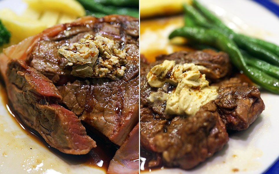 なによりどちらもほどよく分厚く、ナイフを当てて切り分けるとき、手に伝わってくる感触が「肉をこれから食べるんだ」って気持ちを盛り上げゴチソウ感を高めてく。