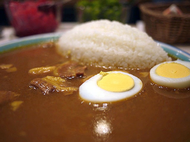 サラサラで薫り高いカレーと、よく煮込まれた分厚い豚のばらの塊。