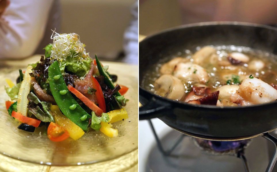 10種類の野菜のサラダをたのむと豆やパプリカ、葉っぱ野菜にトマトなどなど。茹でたり、焼いたり、生のままとか、それぞれ野菜のおいしい状態に整えたのをキレイに持って、生ハムどっさり。