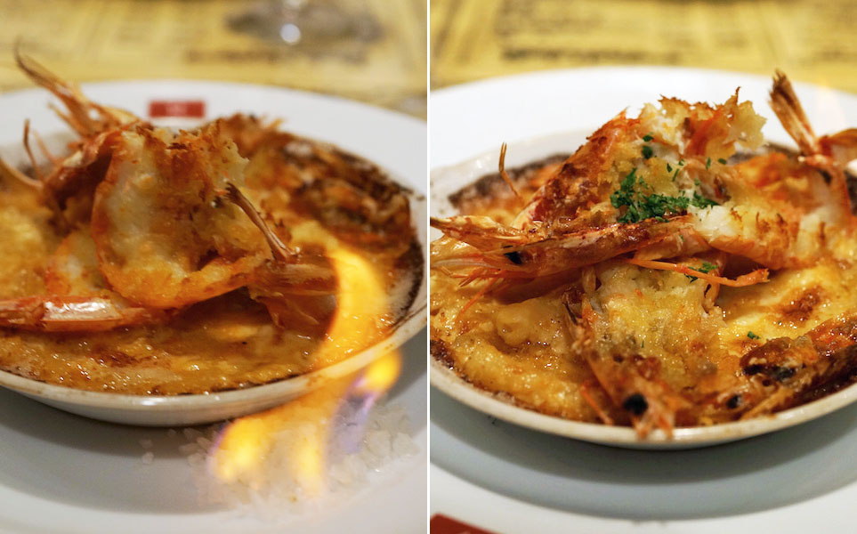 半分に割った手長エビをのせ、ガーリックオイルをタップリかけてオーブンの中でこんがり焼いた、ずっしりとした大人のゴチソウ。