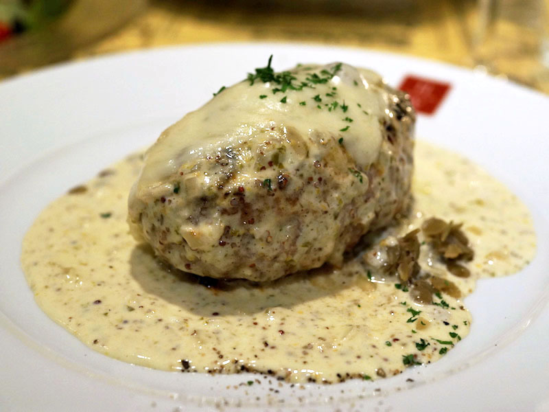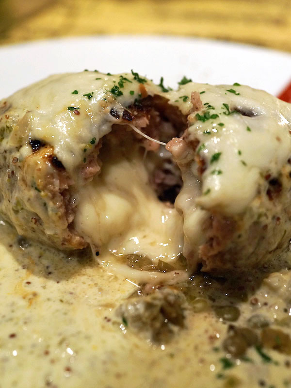 割ると中にもモツァレラチーズ。トロリと溶け出し、さっぱりとした豚肉の繊細な味と食感に濃厚なコクをくれるのがいい。