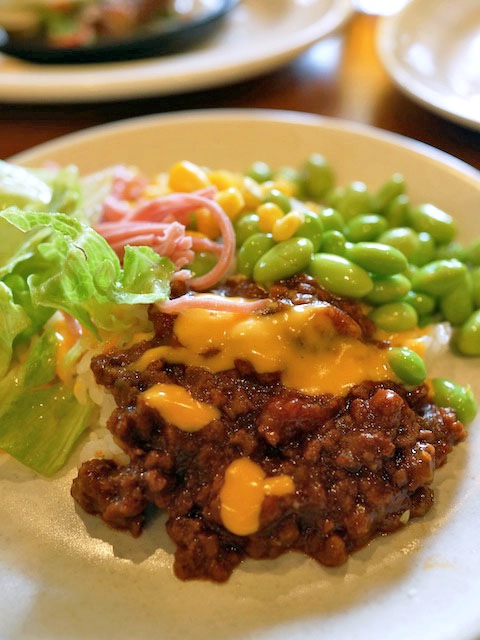ご飯の上にタコスを作るために用意されているチリビーンズととろけたチェダーチーズをタランとのせて作るタコライス風。