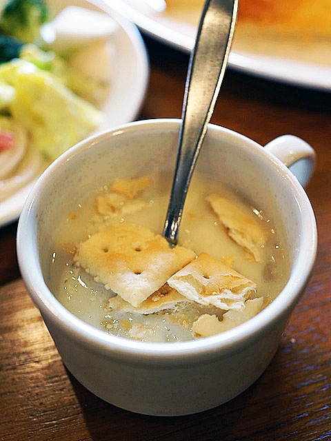 チャウダーにはクラッカーを割ってタップリ乗っけて食べる。
