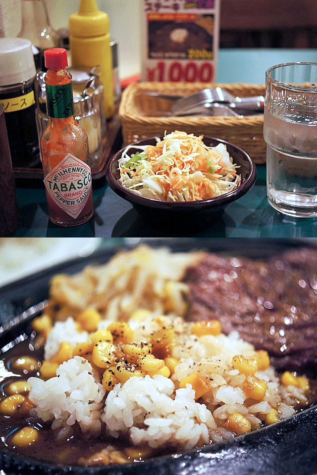肉から滲んだ肉汁と、醤油、タバスコ、いろんな味が鉄板の上にたまってて、そのグレービーをご飯の吸わせる。