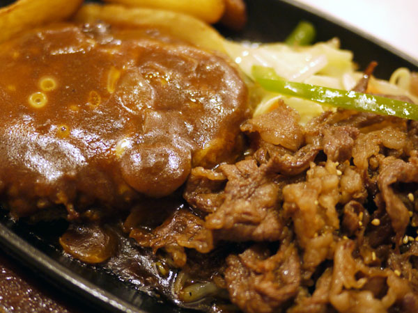 ここのオキニイリ、牛のカルビ焼きとハンバーグの盛り合わせ。