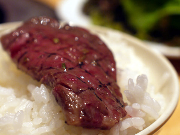 焼きすぎぬよう、目を凝らし、程よきところでひっくり返し、裏返った肉の表面がうっすら汗かくそのタイミングで網から外す。
